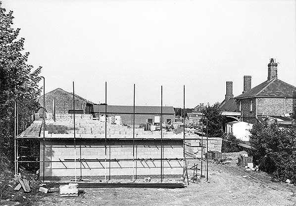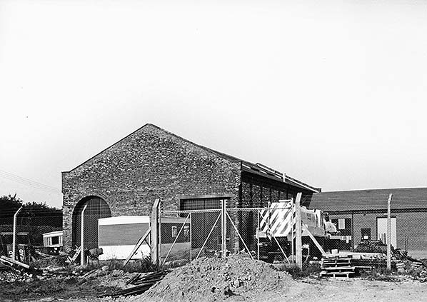 ![]() Looking east at Swaffham in July 1982 as an industrial unit is under construction on the former railway trackbed. Although the station buildings (right) appear to be under threat they would survive and be refurbished and still exist today (2017).