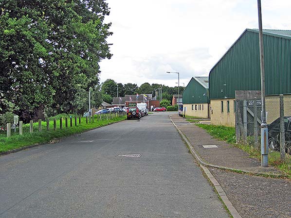 ![]() The view west towards the former Swaffham station from the vicinity of the engine shed access line in August 2017. The station buildings can be seen above the red car in the distance.
