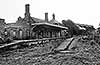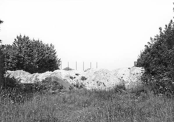 ![]() Looking east towards the site of Swaffham station in July 1982, the trackbed is piled high with rubble. The western gable of the former good shed is glimpsed above the obstruction.