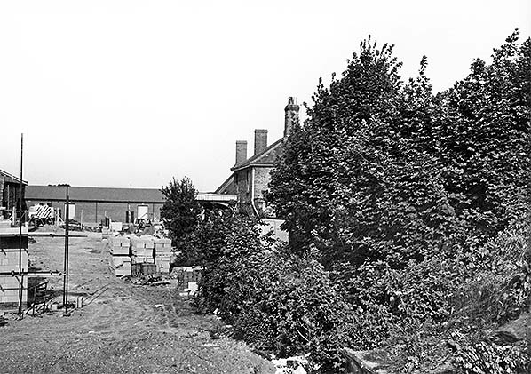 Photo by John Mann ![]() Looking east at the remains of Swaffham station in July 1982, perhaps from the crest of the pile of material seen on the previous photograph. The south platform is to the right with the stationmaster’s house beyond the bushes. The goods shed is far left and beyond it is an industrial building constructed athwart the trackbed. A new industrial unit is under construction in the left foreground.
