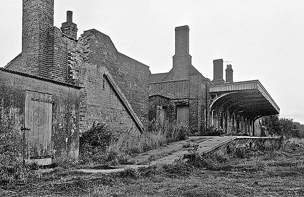 ![]() In October 1975, seven years after closure, Swaffham station is derelict, and the footbridge and rails have been removed.