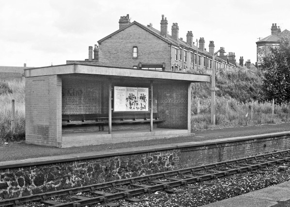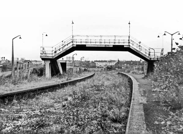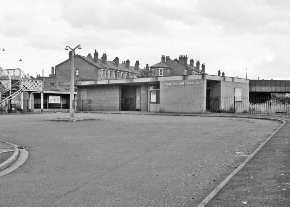 Photo by John Mann ![]() The boarded up station building in the early 1970s with glass strewn on the roadway and pavement along with several letters of the station name missing. Photo by John Mann ![]()
