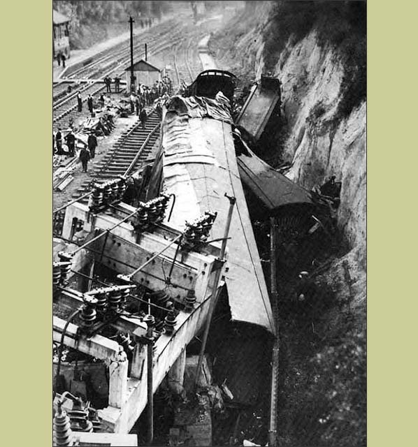 Photo from Jim Lake collection ![]() The train crew comprised Driver Aplin, Fireman Morgan and Guard Godwin. Both Aplin and Morgan suffered shock with Morgan in addition receiving minor injuries; both were otherwise unhurt. There is no record on any notable injuries to Mr Godwin, despite him being at the front of the train at the time of the accident, and indeed he went on to assist the passengers. In this photograph we can see the wrecked wagon in front of the locomotive. The 'E' suggests that the wagon belonged to the LNER. What at first glance looks like one wrecked carriage is in fact the telescoped 2-set No.768 which comprised brake third No.3986 and composite No.6220. Both vehicles had wooden bodies built on steel frames. Levels of safety are often viewed retrospectively; the BR Mk1, for example, once considered safe is now banned from regular main line use but, again, this is retrospective and no vehicle, be it road or rail, can ever be called 100% safe. Nevertheless this photograph shows only too well how vulnerable the old wooden bodied carriages were, even in a relatively low speed collision as occurred here. The ‘L’ class locomotives, of which there were 22 examples, came to be known as 'The Germans' or 'German Locomotives' owing to ten of them being built by Borsig Werke. The remainder were built by Beyer Peacock, including No.1768 which went on to become British Railways No.31768 and survived until December 1961. The hut on the right is a 33kV electrical switching station and was not damaged. Stewarts Lane (spelled with apostrophe in the Report) and Bricklayers Arms breakdown trains attended. Ambulances from Farningham, Sidcup and Dartford attended, taking the injured (and presumably the dead) to Dartford County Hospital. Wilmington and Swanley Fire Brigades also attended as did police. Local taxi drivers also assisted.