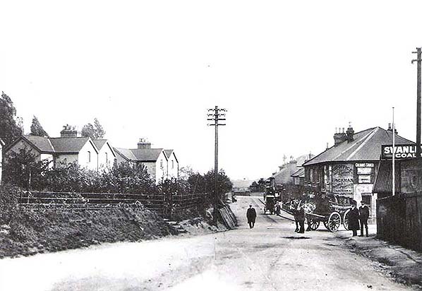![]() A final view from circa 1910 looking north-east along Station Road; the station is behind the photographer. A horse-drawn cart loaded with sacks of coal is emerging from the goods yard on the right. A number of local coal merchants had offices in the yard. The sign on the right reads 'Swanley Junction Coal and Coke Co'; it is mounted on the roof of one of the merchants' offices at the entrance to the yard. The main line is behind the houses on the left; these houses have now been demolished and the land is a council car park.
