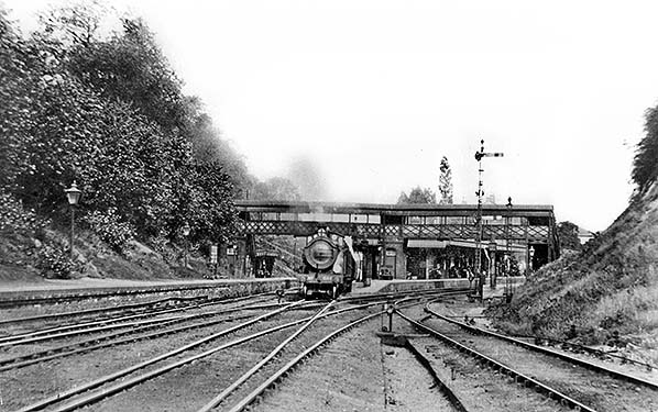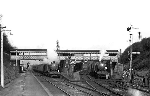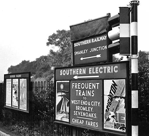 ![]() Sometime in the 1930s, and prior to electrification, a train from the Ramsgate direction departs Swanley Junction, left, behind what appears to be a Class L1 4-4-0. On the right a Class D1 4-4-0 waits with a train from the Maidstone East line. The Southern headcode disc/lamp system differed from that used elsewhere in that it had six positions: one centrally below or in front of the chimney; one each side of the smokebox; and three on the bufferbeam. As seen in other photographs taken around this time, Swanley Junction has electric lighting installed but retains as mix of upper and lower quadrant semaphore signals. There are two signal boxes, one being the camera at the end of the platform and the other around the curve on the up side opposite the goods yard.