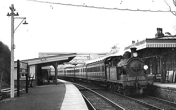 Photo from John Mann collection ![]() Class H 0-4-4T No.1177 takes the line towards Otford sometime in Southern Railway days. The headcode discs tell us that the train is heading for the Maidstone East line. Having previously been No.177 and then, when the Southern was formed, No.A177, she was numbered 1177 sometime after 1928 and probably in 1931. Electric lighting has appeared on the station but conductor rails have yet to be laid, so this photograph will date from the early 1930s. The first three vehicles of the train are a 'birdcage' 3-set and it would appear another such set is also attached. No.1177 spent many years as a Tonbridge resident and as BR No.31177 saw action on the Westerham branch during the morning of that line's last day although she did not operate the final services. Like the Westerham branch, No.31177 also bowed out in 1961.