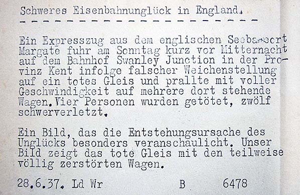 Photo from Swanley History Group ![]() A German surveillance photo of the train crash. This came with German script on the back (see below) which, when translated, reads: Serious Railway Accident in England. Shortly before midnight on Sunday an express train travelling from the English resort of Margate, Kent, was incorrectly switched at Swanley Junction to the wrong track and crashed at full speed into a number of carriages which were parked there. Four people were killed and twelve seriously injured. The photo clearly shows the cause of the accident: the track where the carriages were parked can be seen, with some of the them totally destroyed. Click here to see a larger version.