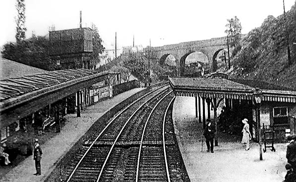 Copyright photo from John Alsop collection ![]() Looking east along the Sevenoaks line from the station footbridge c1920s. Goldsel Road bridge is seen and on the far side the goods shed can just be made out. Note the boarded staff crossing in the foreground; before the footbridge was built c1905 passengers had to use similar barrow crossings at the ends of the platforms to reach the two outer platforms. Note the trailing refuge siding running behind the down platform on the left; this was added by the SE&CR.