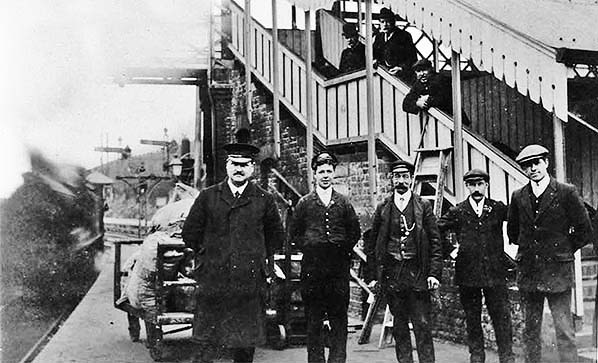Photo from John Mann collection ![]() A collection of cheerful station staff pose for the photographer at the London end of the down branch platform c1930s. The man on the left would have been the stationmaster. The junction signal box is seen in the distance on the down main line platform.