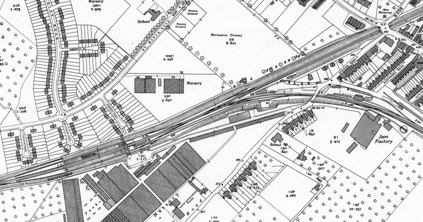 1947 1:2,500 OS Map. The new Swanley station has now been built and opened to the west of Swanley Junction. As the town has continued to grow there has been substantial residential development to the north of the new station with public access from both sides of the line. Two more sidings have been added to the goods yard, together with coal bins. The junction signal box has gone, replaced by a new box at the east end of the new station. The refuge siding behind the down branch platform has gone.