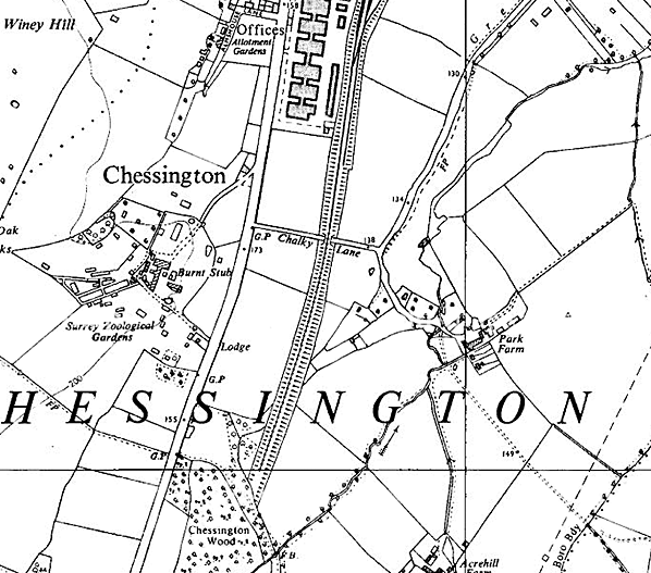 ![]() CHESSINGTON SOUTH EXTENSION[Source: Nick Catford] The branch line to Chessington South opened on 28 May 1939. Chessington South station was built to a design by architect James Robb Scott in 1939 as a through station on the line being built to Leatherhead. There would have been two further stations at Malden Rushett and Leatherhead North. Construction of the extension stopped, never to be resumed, on the outbreak of World War II and the completed up platform at Chessington South was never used for passenger trains, although the track was used for stabling out of service trains during off-peak times. An embankment was constructed from spoil from cuttings elsewhere on the Chessington branch and from the widening of the cutting for the new station at Swanley. The embankment was built by the Royal Engineers as an exercise in the early 1940s and extended for half a mile until it petered out at Chessington Wood. A bridge over Chalky Lane was constructed although it is unclear how much track was laid. The 1962 map below shows track as far as Chessington Wood but a 1949 aerial photograph shows the track stopped short of Chalky Lane. There was a goods yard beyond the passenger station. Parliamentary powers for the Chessington South - Leatherhead line lapsed in 1962. After the continuation to Leatherhead was abandoned, part of the line was used from the mid-1960s to the end of the 1980s for a coal concentration depot. ![]() 1962 1:10,560 shows the embankment as far as Chessington Wood. It is unclear how much track was laid. The June 1949 photo below shows the track stopping some distance short of Chalky Lane.