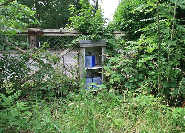 Electrical cabinet on the level crossing gate at Swavesey Station looking east in July 2007