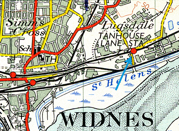 Notes: Tanhouse Lane station was located on the Manchester Sheffield & Lincolnshire Railway and Midland Railway Joint Railway (MSLR &MR Jt) Widnes Branch that connected to the Cheshire Lines Committee (CLC) Liverpool and Manchester line at Widnes East Junction (north-east of Widnes) and at Hough Green Junction (north-west of Widnes). The line had opened between Tanhouse Lane and Widnes East Junction on 3 April 1877 and between Tanhouse Lane and Hough Green Junction on 1 August 1879. When it opened the line had only one passenger station Widnes Central but 11 years later on 1 September 1890 Tanhouse Lane was opened to serve an area of expanding industries.