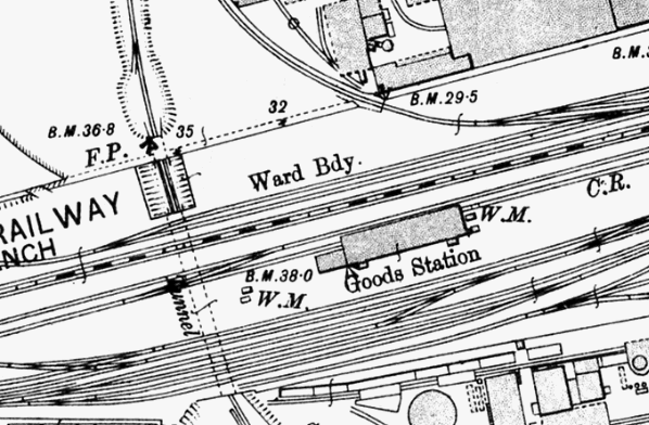 Further east, on the south side of the main line, was the goods shed. It was a large brick building with a slate roof. There was a siding between it and the main line and a line that ran through it. To the south of the goods shed there were seven sidings.