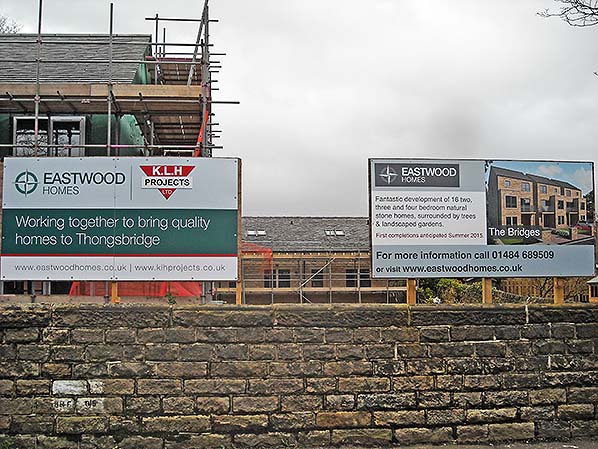 ![]() Looking south-west on 2 February 2106 from Springwood Road bridge in Thongsbridge – spelling as on the information board (left). Details are given of the housing development on the site of