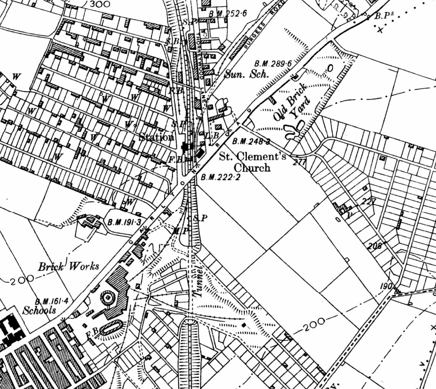 ![]() Station Name: THORNEYWOOD![]() 1901 1: 10,560 (6") map showing Thorneywood station and the surrounding area. Sneinton tunnel is seen to the south. A rope worked incline behind the up platform ran in a tunnel under Porchester Road into the Thorneywood Brickworks of the Nottingham Patent Company. To the south of the station on the down side a another siding ran into the Nottingham Builders' Brick Company works.