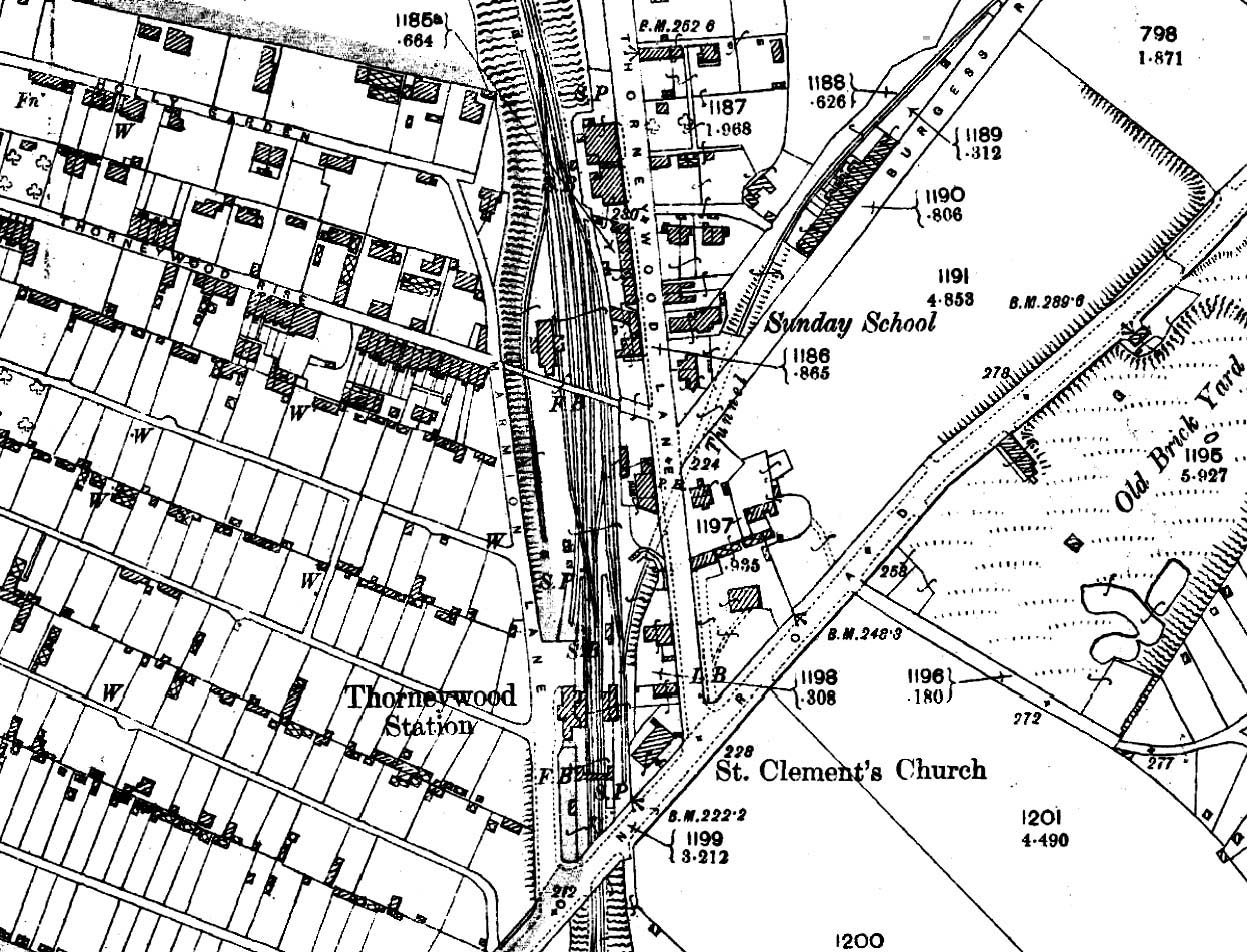 1912 1:2,500 OS map shows the layout of the station and goods yard. The station fronts directly onto Marmion Road. There are facing buildings on the two platforms with a footbridge spanning the line to the south. To the north, a public footbridge spans the cutting linking Marmion Road and Thorneywood Lane. The goods yard is on the down side to the north of the station with its entrance off Marmion Road just north of the station building. The yard comprises two loops, one passing under the canopy of a large goods shed. From these a short siding runs behind the north end of the down platform where there is a cattle dock. A weighbridge and office are seen just inside the entrance to the yard. The small building to the south of the main station building is a lamp room. An additional siding entered from the north loops around the western perimeter of the yard. There is also a loop on the up side; from this a rope-worked incline runs through a short tunnel under Thorneywood Lane and on to the Thorneywood Brickworks. All traffic movements around the station are controlled from two signal boxes: one is on the up platform just north of the waiting room, and the other is to the north of the goods yard on the up side. The stationmaster's house is the second (L-shaped) building along Thorneywood Lane on the left. The next building north is the Cooper's Arms public house..