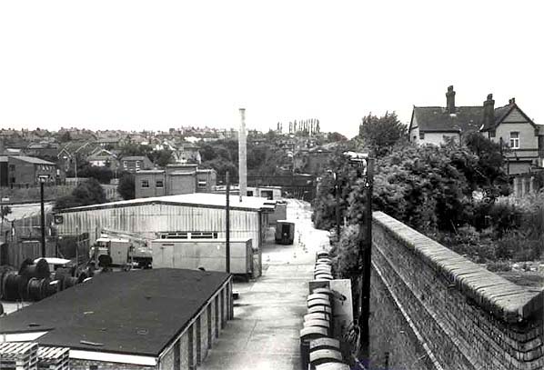 ![]() Station Name: THORNEYWOOD![]() Looking north at the site of Thorneywood station from Carlton Road in July 1981. A GPO engineering depot occupies the trackbed up to the south portal of Thorneywood tunnel.