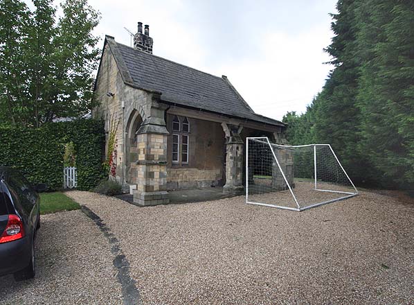 Thorp Arch station booking office in September 2010. The entrance, which has now been filled in, was in the centre of the covered walkway.
