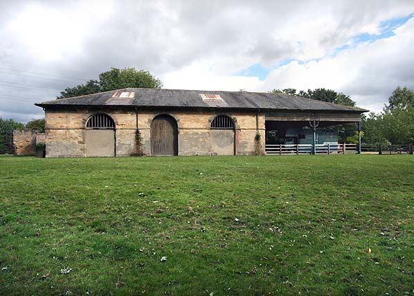 Thorp Arch goods shed in September 2010. The 2 x 2-bay canopy is an unusual feature, doubling the length of the shed. Lunettes either side of the central doors allowed light into the shed.