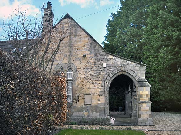 Thorp Arch station entrance in April 2013. Access to the booking office was through this Gothic loggia, with buttressed pointed arches at the south end of the station building.