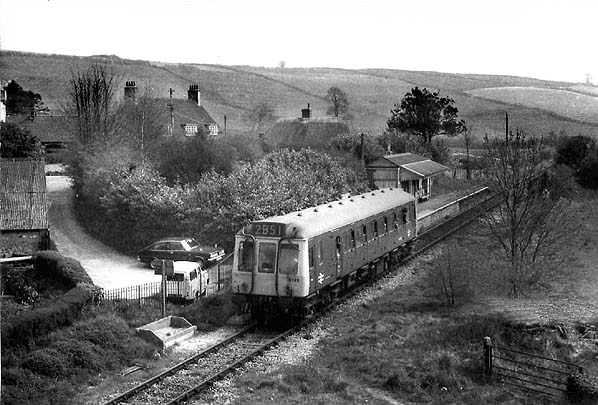 ![]() Station Name: TOLLER![]() In its latter years, although the branch train service was relatively frequent, the passengers were few, and a single diesel car was sufficient on many workings. In April 1975, shortly before the station’s closure, Toller is viewed from the south-west. The charming rural setting amidst rolling
