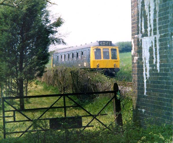 A single-car DMU has just passed under the Lower Road bridge west of Toller station bound for Bridport on 3 May 1975, the last day of public service.
