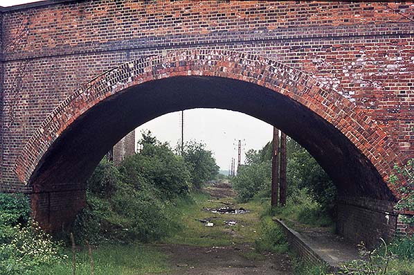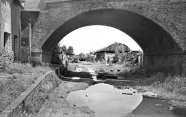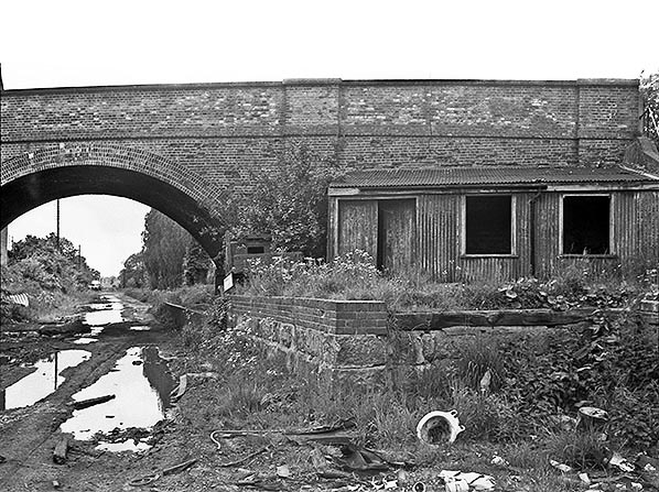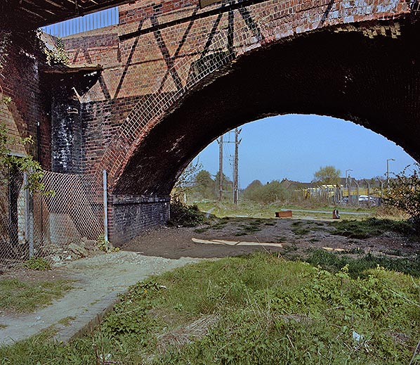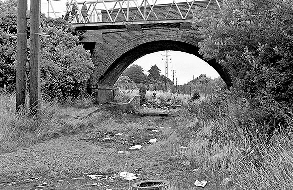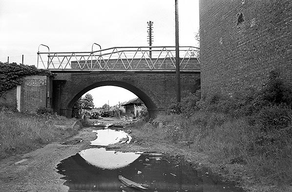 Photo by Nick Catford ![]() By April 1983 the trackbed under the bridge has been raised and the dock is now barely visible. It is likely that the buried dock exists today. Beyond the bridge the military depot has been demolished and the site is occupied by a GPO engineering centre.