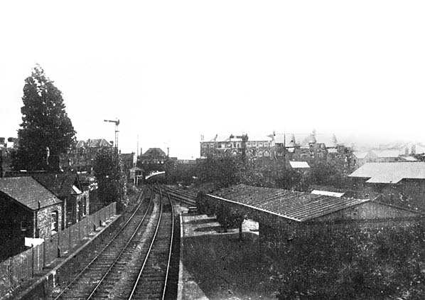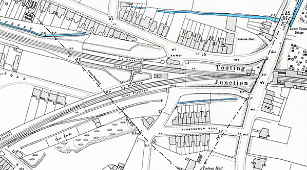 Notes: Tooting or Tooting Junction Station (both names were used) had three platforms, one side 'up' platform on the north side of TM&WR loop line which also included the stationmaster's house and booking office, a second side 'down' platform on the Merton Abbey line and a large island platform with one face acting as the 'down' platform for the northern loop and another face acting as the 'up' platform for the southern loop. This platform was roughly triangular as the two lines diverged at this point and had a central awning at its east end. Tooting goods station was sited to the west of the station on the southern loop.
