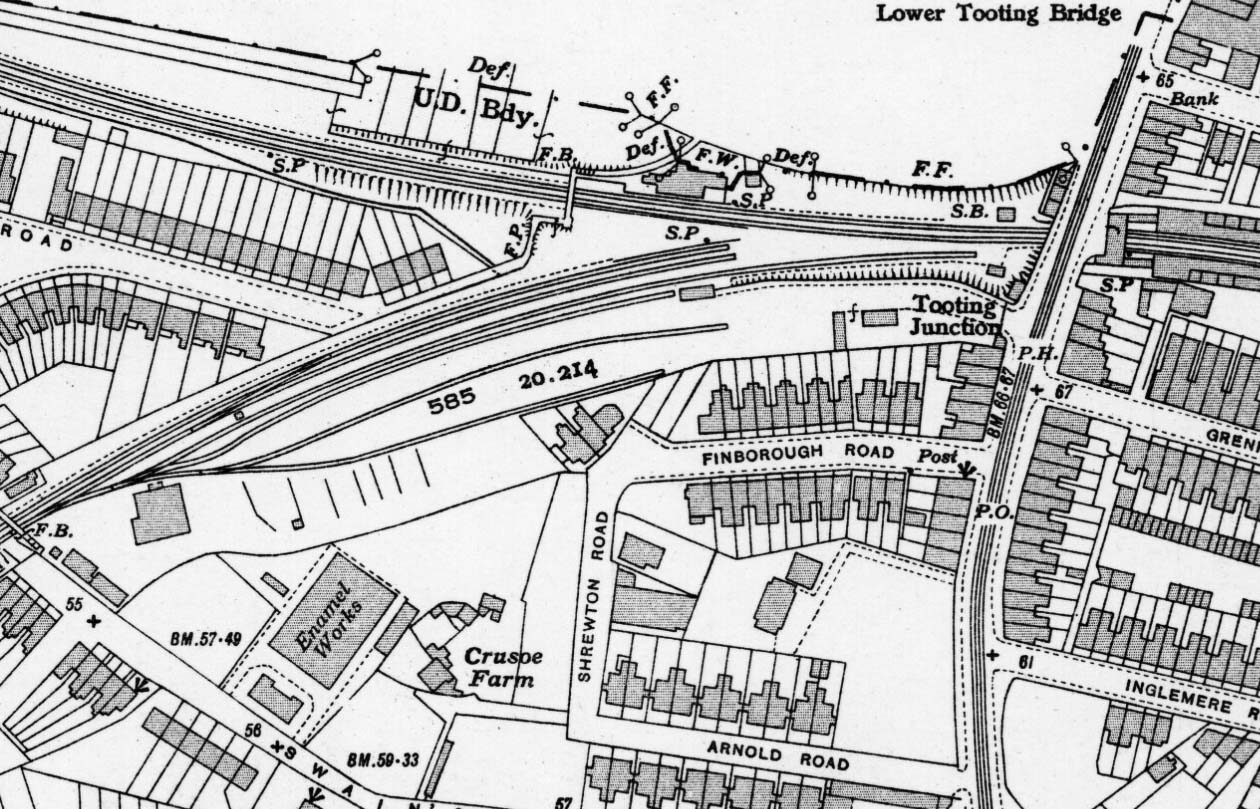![]() Station Name:TOOTING JUNCTION![]() 1934 1: 2,500 OS map. The station is now closed. The goods yard has been relaid with an new rail served warehouse to the west of the coal yard. The goods yard can now only be accessed from Mitcham Road. There has been some residential development between the two lines. ![]()