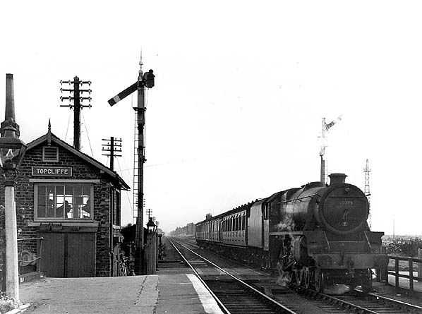 Looking east from the down platform as a westbound local train leaves Topcliffe c.1954