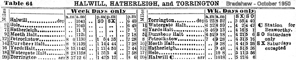 Stations served by local passenger trains from Torrington included : Bideford, Instow, and Fremington in the Barnstaple Junction direction, and Watergate Halt, Yarde Halt, Dunsbear Halt, Petrockstow, Meeth Halt, Hatherleigh and Hole (for Black Torrington) in the Halwill Junction direction.
