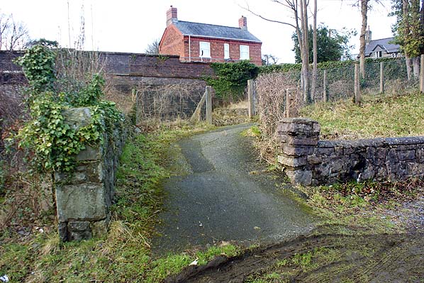 The later pedestrian footpath, viewed from the platform on 31 January 2013. In the background is the stationmaster’s house. The only evidence that the earlier covered staircase ever existed is the paler coloured brickwork in the wall to the left of the house.