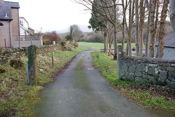 A view down the access road to the Tregarth station goods yard on 31 January 2013. In the bottom right hand corner is the beginning of the footpath to the platform.