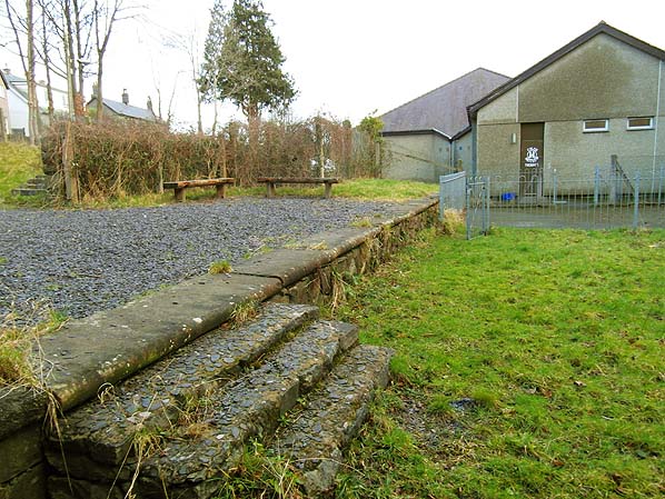 Looking west at Tregarth station on 31 January 2013. The small surviving section of the station has been made into a seating area, and the trackbed had been grassed over.
