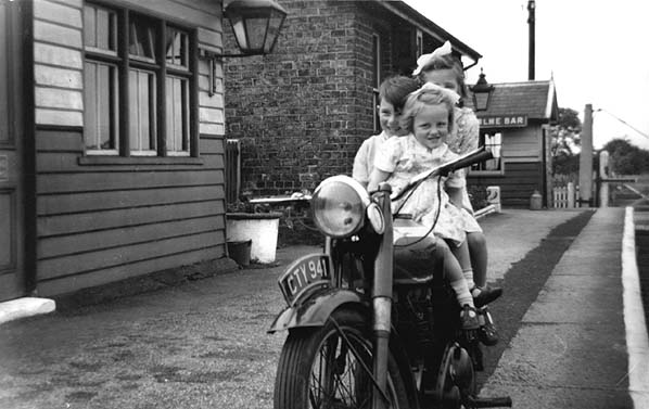 Trenholme Bar station in 1955, the Brown family with the stationmaster's motorbike.