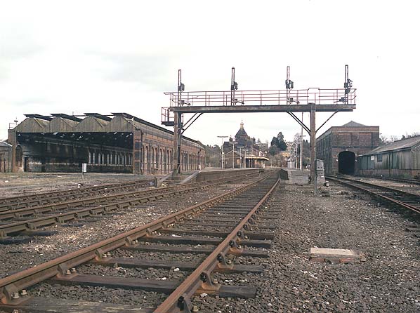 Tunbridge Wells West Station looking east in March 1986. The engine shed is seen on the left and the goods shed on the right.