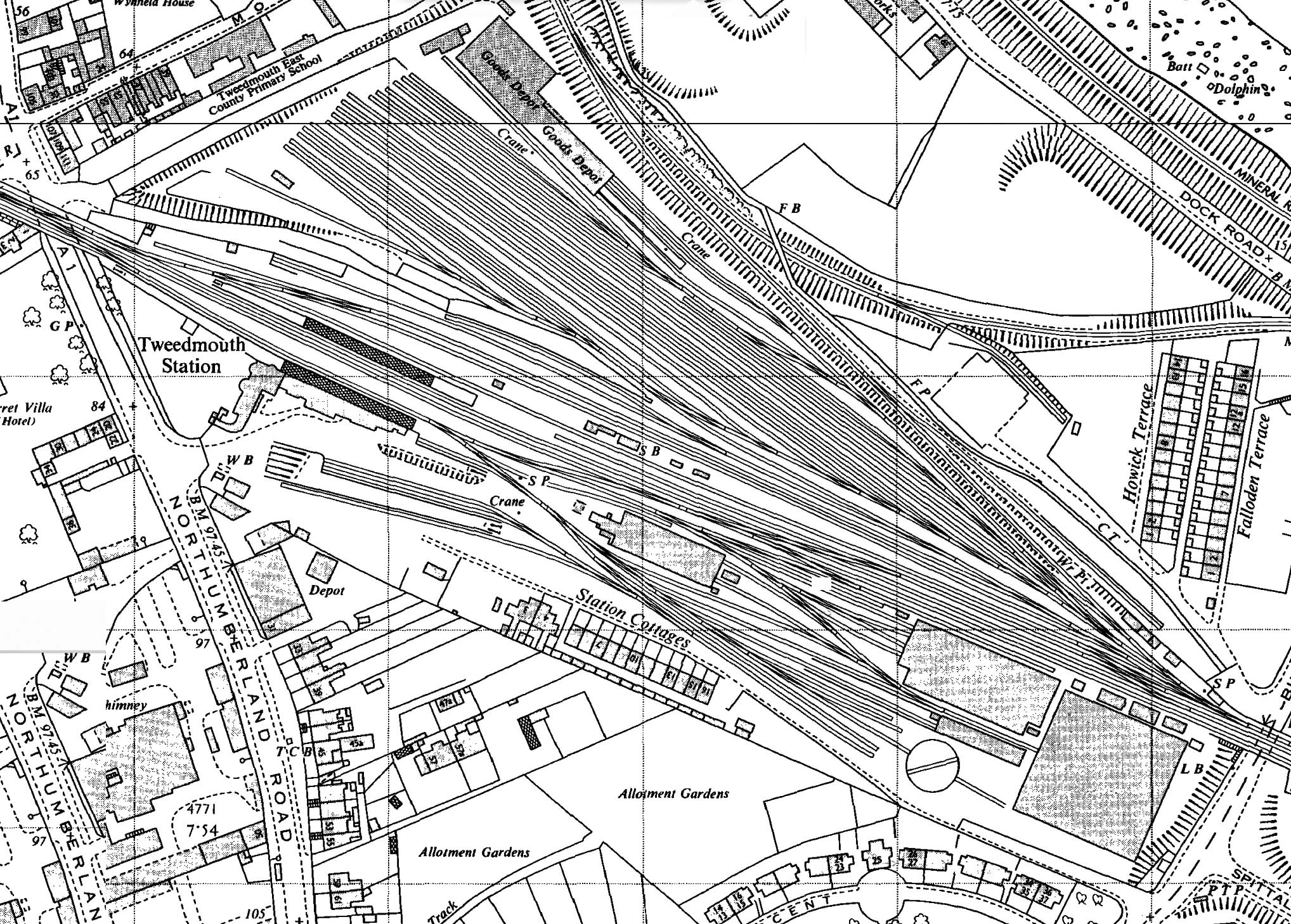1963 1:2,500 OS map.The extensive facilities at Tweedmouth remain in 1963, but by this time the passenger station’s closure has been announced, and the few passenger trains that still call would cease to do so in June 1964. The ‘Goods Shed’ in now named – twice, as it is divided between adjacent OS sheets. ‘Station Cottages’ (the original Newcastle & Berwick Railway enginemen’s accommodation) are at last named on the map and numbered 5 to 16, and the later semidetached houses are numbered 3 and 4; all of these houses would disappear along with the passenger station a few years later. The Tweed Dock branch is still shown, but the branch to the saw mill is no more. Click here fror a larger version.