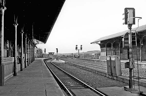 ![]() Looking south-east along the down platform at Tweedmouth c1966 after closure to passengers. The running-out LNER nameboard is seen, together with a redundant lamp post and the