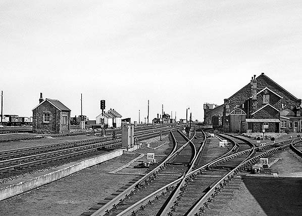 Photo from NERA ![]() Tweedmouth station on 2 April 1967. The view is north-westwards along the down platform beneath the platform roofing. The gas lamps are still in place, as is the LNER running-in nameboard on the up platform. Tweedmouth signal box, which replaced the station’s North and South boxes in 1961, is in the distance. Photo by Graham Johnston from Railways of Berwick and the Eastern Borders private Facebook group ![]() Tweedmouth station, looking south-east from beyond the end of the down platform on 1 April 1967. The engine repair shop and loco shed are ahead,