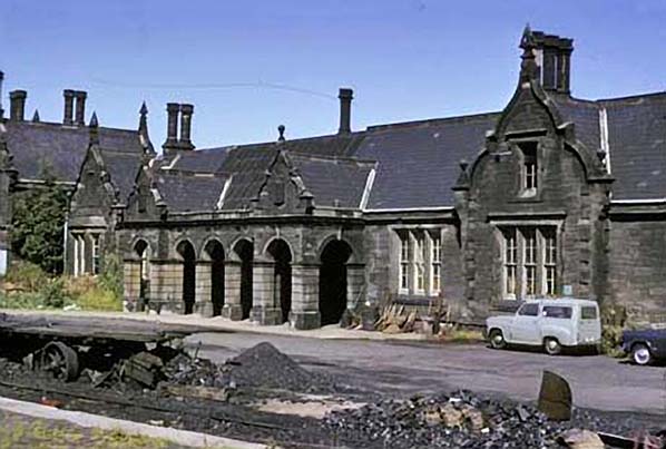 The elegant but grimy frontage of Tweedmouth station is seen in August 1966, looking north across the forecourt. The dignity of the approach to the station was somewhat disfigured by coal sidings which abutted it, seen in the foreground. By this date Tweedmouth station had been closed to passenger traffic for over two years, and it would be demolished before the end of the decade. Coal traffic continued to be handled at Tweedmouth until the 1980s.