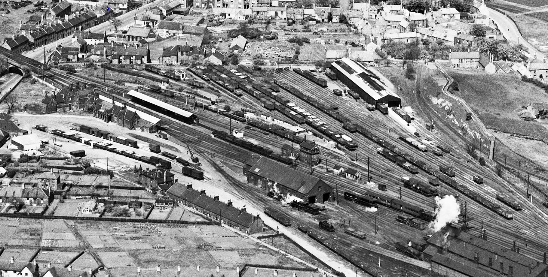 Station Name: TWEEDMOUTHAn oblique aerial view of Tweedmouth station in April 1949, looking north. The Newcastle & Berwick Railway station building is seen far-left, the single-storey offices and waiting facilities stretching along the down platform, and the two-storey former Station Hotel set at right angles to them. The forecourt is shared with the coal depot, and sidings on which coal and livestock wagons are standing can be seen; the crane to service these sidings is at the lower right corner of the image. The East Coast main line widens to four tracks through the passenger station, and on the far side of these tracks the up platform is seen; its platform roofing, installed in 1906 when the original trainshed was dismantled, is conspicuous and complements the roofing on the down platform. A little below the centre, on the down side, is the Gothic N&B goods warehouse, which was adapted by the North Eastern Railway to serve as a loco repair facility and was still used as such at the time of this photograph. The N&B loco shed is in the lower right corner; this straight 4-road shed was supplemented by a larger ‘square roundhouse’ in 1877-78, out of sight to the right of the 4-road shed. A double track ramp alongside the shed runs over the coal drops. The goods sidings and the large warehouse (built 1902-03) occupy a large acreage on the up (far) side of the main line and passenger station. The freight branch to Tweed Dock curves off the picture to the right, reached by a reversal from the goods yard. Tweedmouth South signal box is just right of centre, between the up slow main line and the goods sidings. On the main line, between the loco repair shop and loco shed, a two-coach passenger train can be seen. This is probably a Berwick to Kelso working which has passed through Tweedmouth station and its loco is now propelling back into the down platform where it will call before proceeding to Kelso. Trains serving the branch