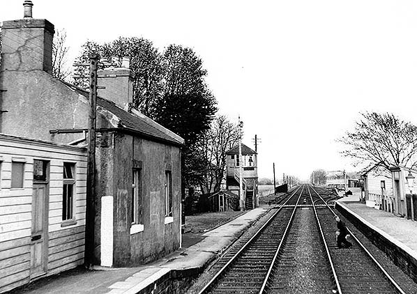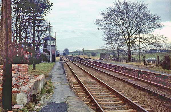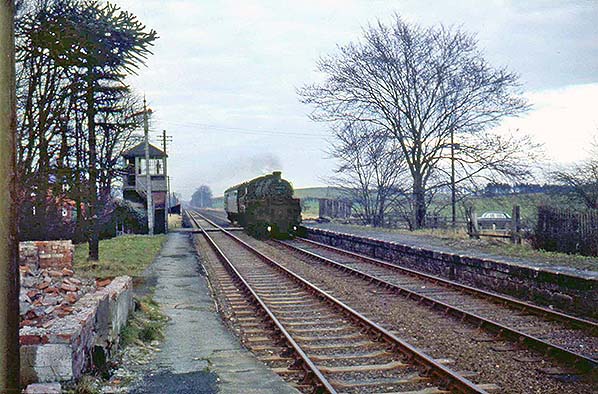 ![]() Looking north-west from the disused Twizell station possibly in winter 1963-64 as a local passenger train bound for Kelso and St Boswells approaches in the distance. The station closed to all traffic in 1955. In the foreground are the remains of the station building at the ramp of the up platform, and a tarmac path continues to the signal box and level crossing. The timber buildings on the down platform have been removed. Beyond the level crossing the goods sidings on the right have been lifted but the redundant loading gauge is still in place.