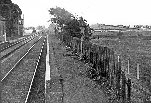Photo from Colin Ashmore from Railways of Berwick and the Eastern Borders Facebook Group ![]() Looking north-east along the down platform at Twizell, probably from a Kelso-bound train. The date is September 1955, so the station had closed to all traffic a few weeks earlier when passenger trains ceased to call. With its clean white lining and lanterns still in place the station could still be in use. To the left the main building and up platform ramp are visible with the signal box close to the level crossing. The goods yard at this station closed in 1953 and the sidings which were beyond the level crossing on the down side have been removed.