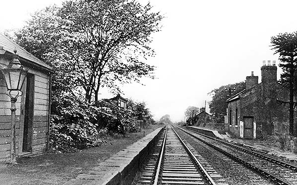 Copyright photo by RM Casserley ![]() Twizell station looking south-west in August 1958, three years after it had closed to all traffic. The platforms and all of the buildings are intact and the lanterns are still in place, although the station is beginning to show signs of neglect. Beyond the station two railway cottages can be seen on the up side of the line.