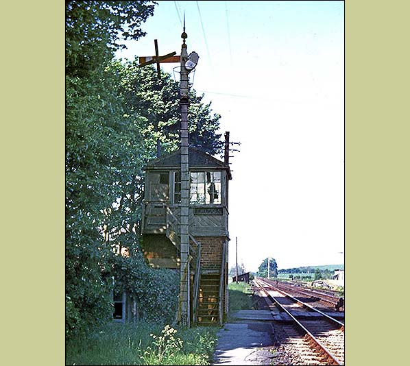Twizell signal box in June 1963, looking north-east from the path to the disused up platform. The ‘X’ on the signal indicates that it is not in use.