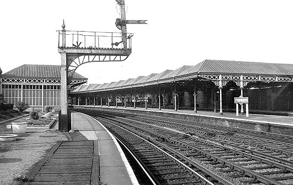 Tynemouth station in 1959, looking north from the down platform. The expanse of platform roofing can be appreciated here, visually enhanced by the gentle curve of the platforms. The LNER ‘running-in nameboard (actually in a running-out position) is of the unusual ‘diamond’ style believed to be unique to the Coast Circle stations. Some remnants of the formerly ambitious station garden can be