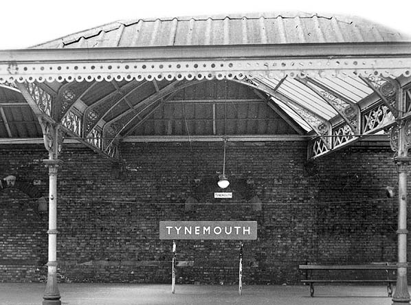 Details of down platform lighting and signage beneath one of the ridges of the glazed ridge-and-furrow roof are seen on this view from June 1969. One might expect to see the BR(NE) vitreous enamel nameboard fixed to the back-wall, but owing to the great width of the platform it is