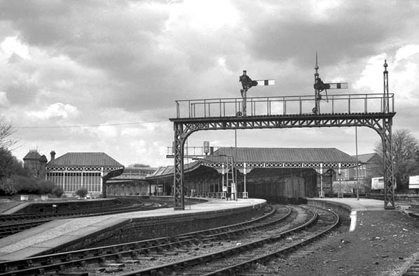 Tynemouth station looking north in 1971. By this time the station has acquired massive lamp standards. One of the southern bays is occupied by a rake of wagons. The right hand semaphore