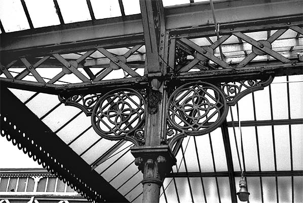 Detail of the elaborate ironwork supporting the roofing at Tynemouth station in September 1972. The columns have Gothic capitals and the spandrels within the brackets are decorated with a pleasing geometric design of a diamond and interlaced circles.